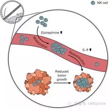 日常体育锻炼可以降低癌症发生率以及抑制其复发,已为人所熟知,但是这一现象的分子机制却一直不为人知。在本论文中,研究人员将荷瘤小鼠随机分组后,分别进行常规爬轮运动实验,在5组不同肿瘤模型中,均发现运动可以将肿瘤发生率下降至60%,并且可以显著抑制瘤体生长。通过基因芯片表达数据分析,运动主要提高了与免疫功能相关的信号。其中,瘤体内的NK细胞浸润程度在运动小鼠中明显增加。进一步的机制研究表明NK细胞的动员受到肾上腺素的调节,抑制该信号通路可以阻断运动抑癌的效果。此外,肾上腺素可以选择性动员IL6敏感型NK细胞,抑制IL6通路也可以降低运动抑癌的效果。综上,体育锻炼、肾上腺素、IL6和NK细胞的动员及分布共同决定了最终的抑癌效应。