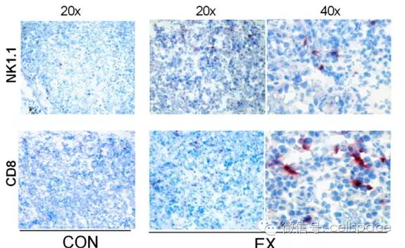 再次,基于上述的芯片数据,在基因表达的基础之上,验证了细胞水平的结果。最先想到的就是检测瘤体内的免疫细胞的浸润程度(流式分析和免疫荧光染色),这里的实验结果表明NK细胞的浸润程度最高。